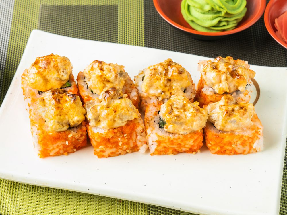 Сыр, омлет, лосось, икра масаго, спайси соус