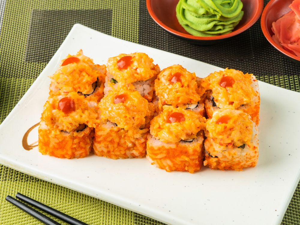 Сыр, лосось, огурец, икра масаго, краб, спайси соус, соус шрирача