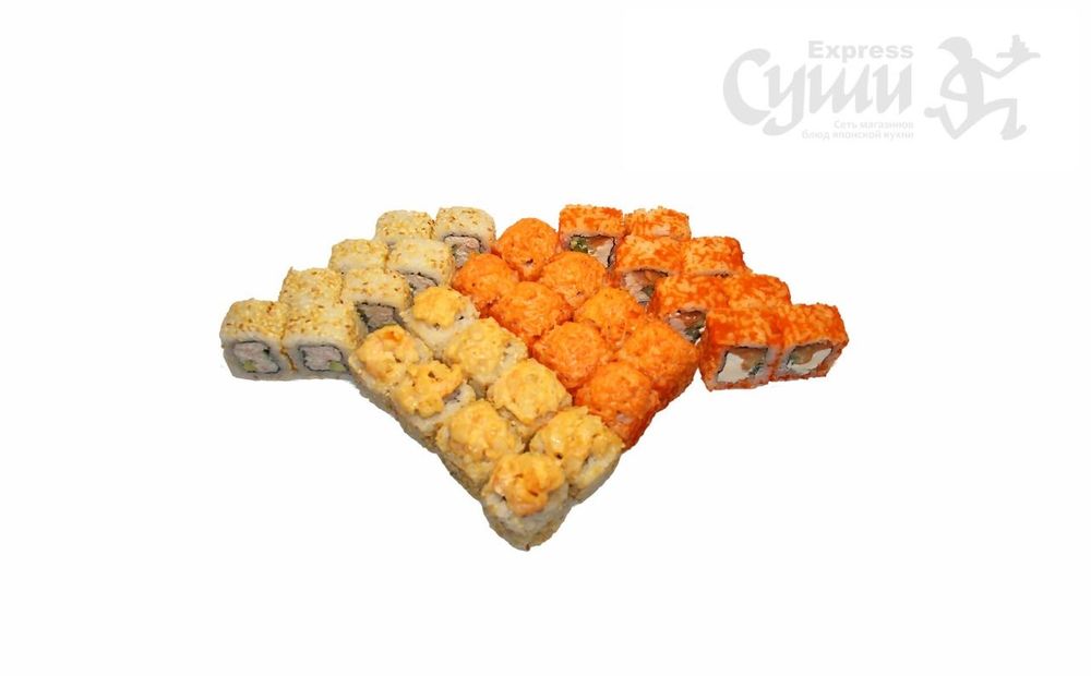 Ролл «Филадельфия тобико», ролл «Калифорния», запеченный ролл с креветкой, запеченный ролл «Сафари»
