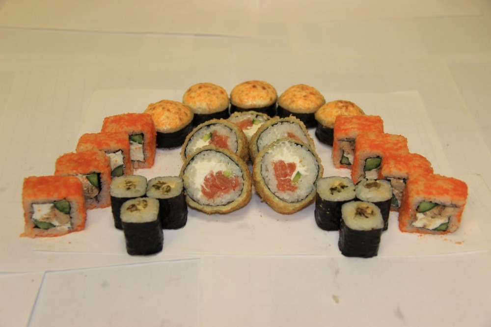 Ролл саке тизу , мини ролл с мидиями, саке темпура, запеченный ролл такеши.